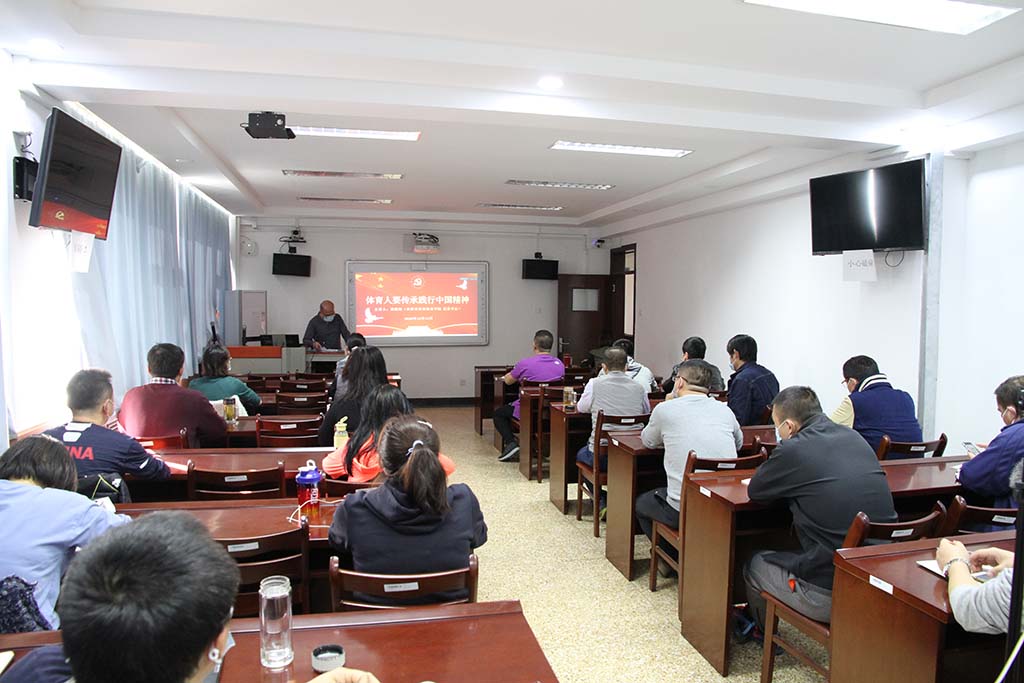 “体育人要传承践行中国精神”进行详细解读,讲座内容深入浅出,阐明了体育精神所具有的深邃的思想渊源和丰富的精神内涵。殷俊海书记在讲座中指出,新时代体育人要传承和发扬中国精神,就要以“带头拼、加油干”的状态激励体育人艰苦奋斗;以“人民为中心”理念加快全民健身与全民健康深度融合;以“使命在肩,奋斗有我”的精神做强竞技体育;以“中国智慧和中国自信”发展体育产业;“以传播正能量”为己任发展体育文化;以“人类命运共同体”理念开展国际体育交流。